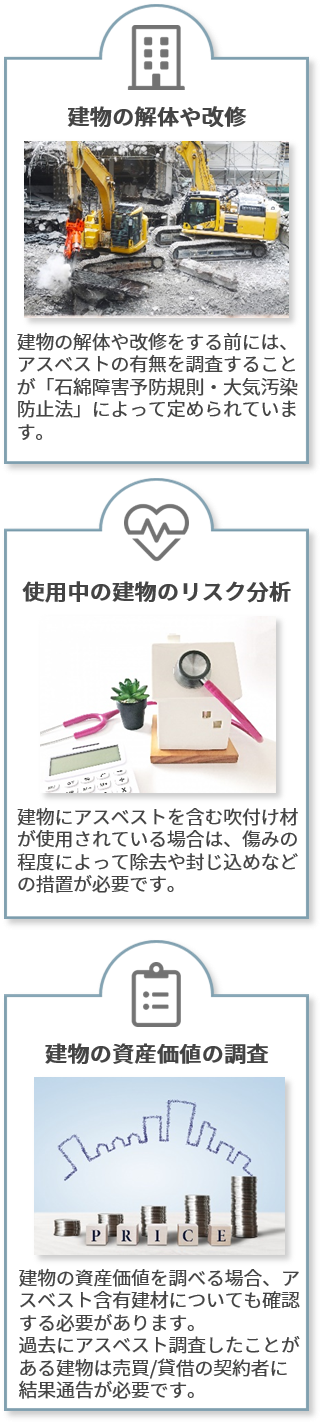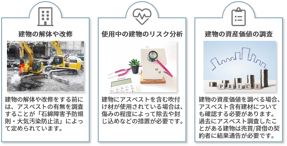 天然に産する繊維状ケイ酸塩鉱物の総称であるアスベスト(石綿)は、国際的に製造や輸入、譲渡、使用が禁止され、規制基準も年々厳しくなっています。